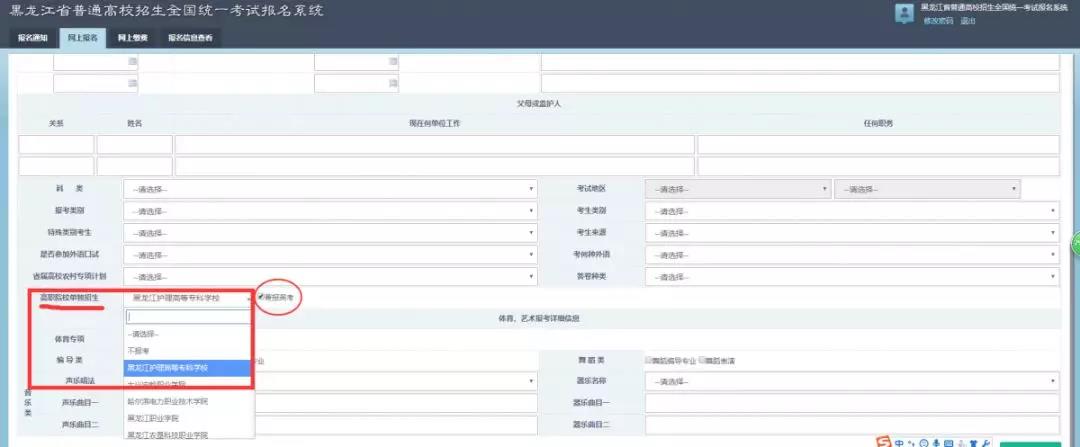 ④ 高职学校单独招生选项中,选择黑龙江护理高等专科学校(学校代码:8037),可点击兼报高考项