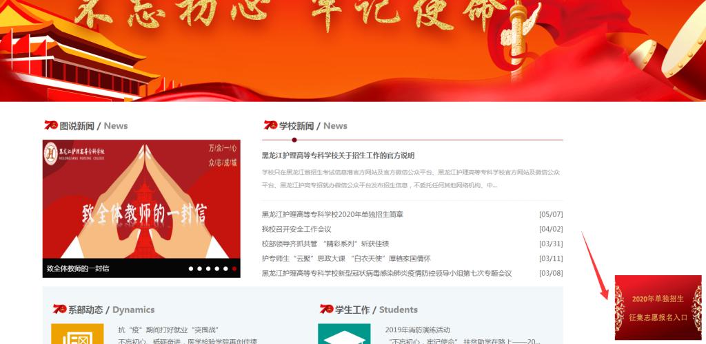 考生需登录黑龙江护理高等专科学校官网(http://www.hljnc.edu.cn/)后,点击右下角悬浮窗口“单独招生征集志愿报名入口”。