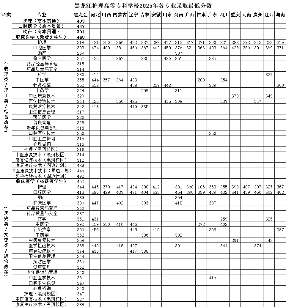 黑龙江护理高等专科学校2025年普通高考各专业录取最低分